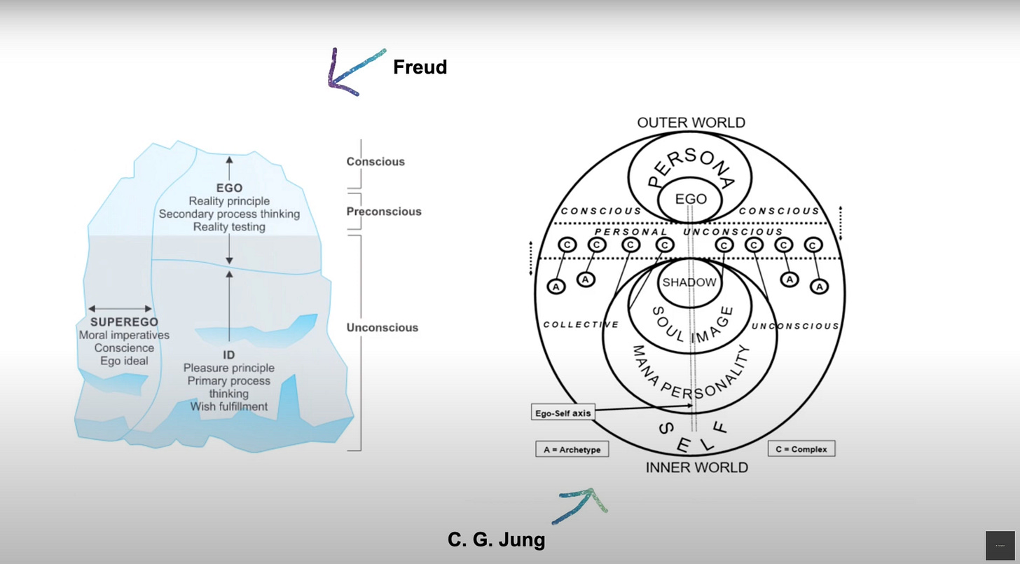 Nhìn vào đây chúng ta thấy cả Jung và Freud đều công nhận sự tồn tại của vô thức, đó là cái cơ bản nhất của phân tâm. Nhưng Freud coi vô thức bao gồm tiềm thức và vô thức, còn Jung thì coi vô thức bao gồm vô thức thuộc cá nhân và vô thức của tập thể. Freud thì không đồng tình với ý tưởng về vô thức tập thể này, và các thành phần khác bên trong nữa.